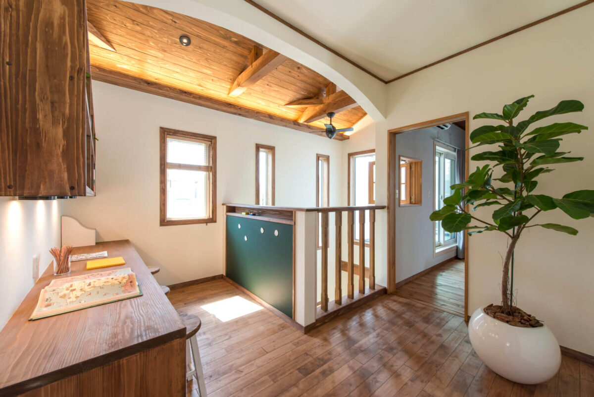木の家具やステンドグラス、小物などがマッチする南欧風の家がまた心地良い。2階ホールのムダを有効活用をしてワークスペースを設置したり、壁一面をタイル張りにしたりなど、どんな「スキ」でも順応するレバンテはまるで親の背中を見て、育つ子供のよう・・・。暗がりではまた雰囲気を変え、1日で2回の暮らしを実感できる素敵なお家です。