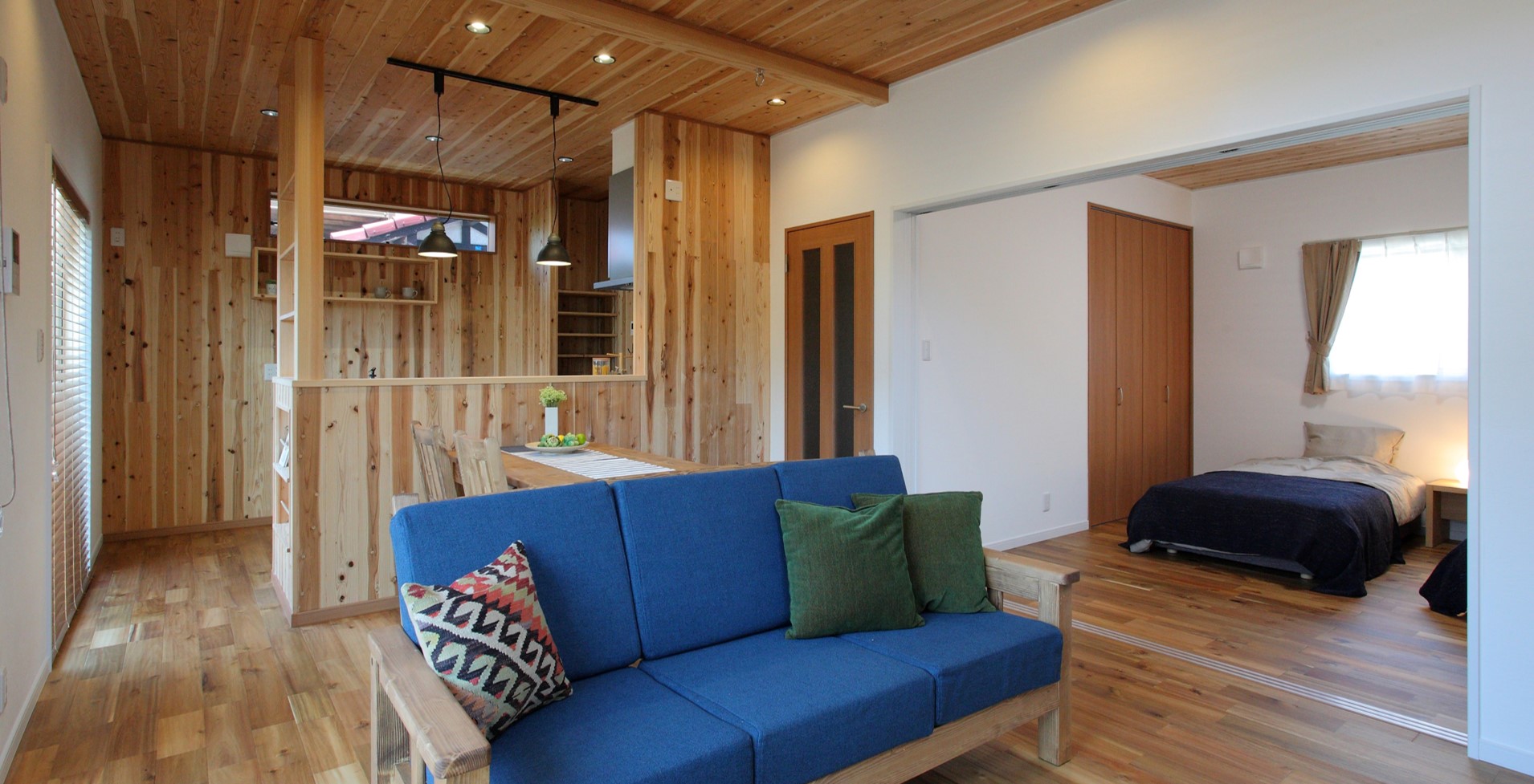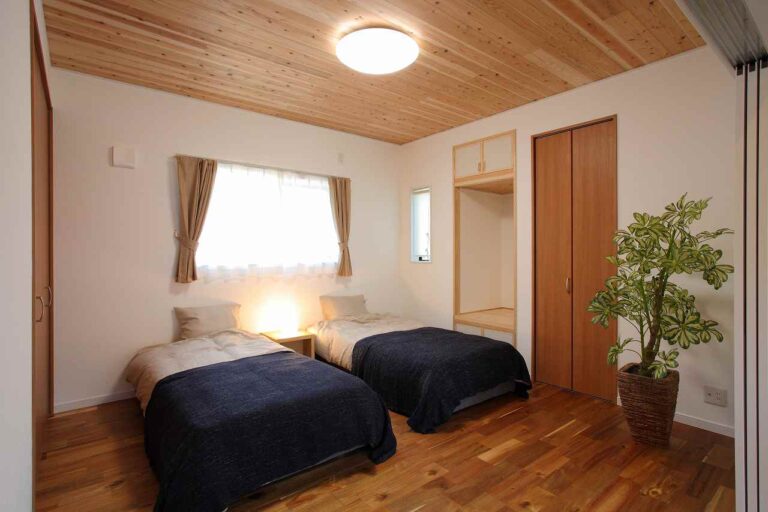 木を感じさせてくれる心地よい寝室がまた家族をホッとさせてくれます。小さな収納と大きな収納を分け、使い勝手に応じて使い分けられたり小物や雑貨などを置いて着飾ったりと家族団らんのひとときをお過ごしいただけます。