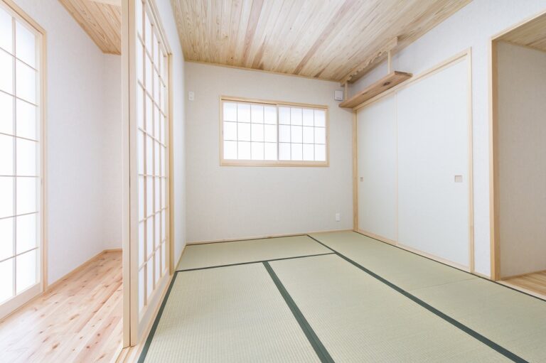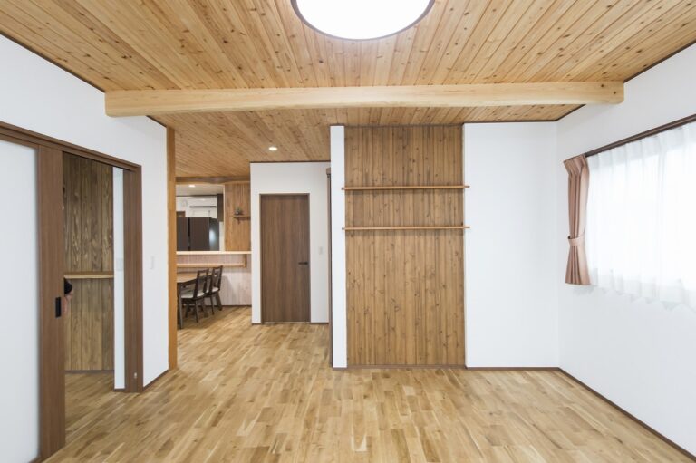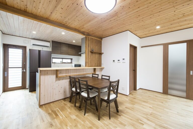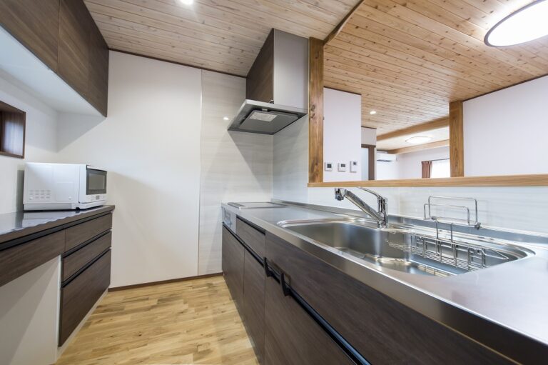 リビングや玄関空間とまた雰囲気を変えたキッチンや和室スペース。リビングや玄関の木の重厚感とは裏腹に明るい雰囲気にそろえた空間がまたギャップを生みます。