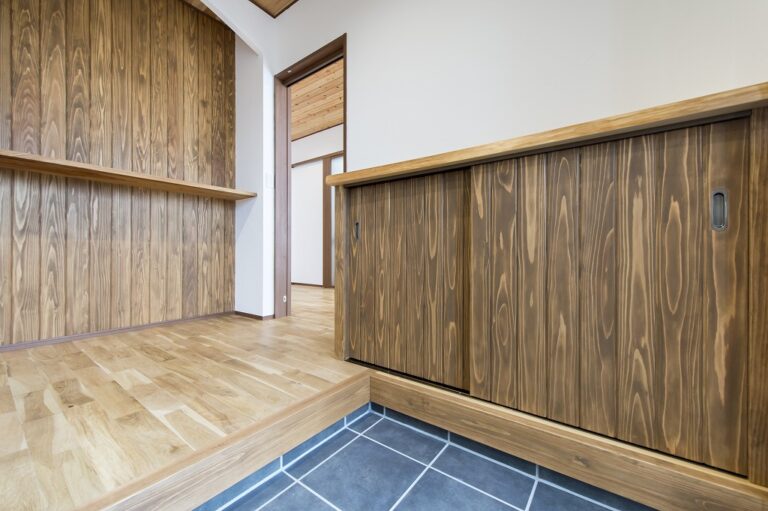 造作の収納棚、そしてそれに合わせて腰板が玄関から入ったらインパクトを与えてくれる見た目に。
